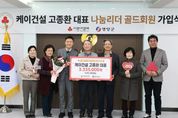 대경타임즈 김완태 기자 | 영양군은 지난 3월 12일 군청 소회의실에서 경북사회복지공동모금회와 함께 케이건설 고종환 대표의 ‘나눔리더 골드회원’ 가입식을 가졌다. 이번 가입식은 지역 내 나눔 문화를 선도하고 소외된 이웃에게 희망을 전달하기 위해 마련되었으며, 이날 행사에는 손병일 경북 사랑의열매 사무처장, 이인형 영양군 나눔봉사단장 등이 참석하여 고종환 대표의 나눔리더 골드회원 가입을 함께 축하했다. 나눔리더는 지역사회의 나눔문화 확산을 위해 경북 사랑의열매가 운영하는 개인기부자 프로그램으로, 100만 원 이상을 기부했거나 1년 이내 납부를 약정한 개인 기부자가 참여할 수 있으며, 나눔리더 회원 가운데 기부금이 500만 원 이상인 경우 실버등급, 1천만 원 이상인 경우 골드 등급으로 예우하고 있다. 케이건설 고종환 대표는 2024년 결혼 33주년을 맞아 333만 3천 원을 기부하며 지역사회 나눔에 동참했으며, 이후 매년 결혼기념일마다 1천 원씩 증액해 기부를 이어오고 있다. 이번 나눔리더 골드회원 가입을 통해 지역사회 어려운 이웃을 위한 나눔 실천을 지속해 나갈 예정이다. 고종환 대표는 “우리 가족