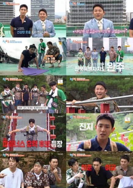 의욕이 넘치는 새 멤버들과 달리 기존 멤버들은 가파른 경사에 곡소리를 절로 냈고, 앞서나가던 이준 역시 '1박 2일'만의 만만치 않은 촬영 방식에 혀를 내둘렀다.