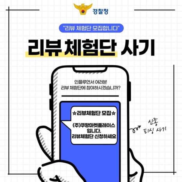 유명 브랜드 ‘쿠팡’, ‘테무’ 등을 사칭하여 리뷰 체험단 모집을 빙자해 문자 또는 전화