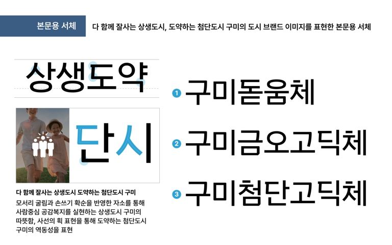 전용서체 개발은 구미시가 추구해온 상징성과 미래 가치를 효과적으로 전달하기 위한 사업이다. 지난 5월 시각디자인 및 옥외광고 전문가의 의견을 반영하여 타이틀용 2종과 본문용 1종을 최종 선정했다.