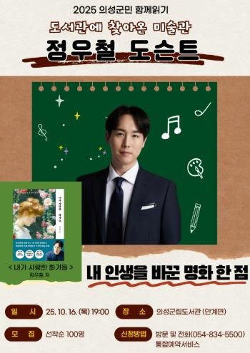 디지타임즈(DGTIMEZ) 김대경 기자 | 의성군은 오는 10월 16일 의성군립도서관에서 정우철 도슨트를 초청해 '내 인생을 바꾼 명화 한 점'을 주제로 저자강연을 개최한다고 밝혔다.