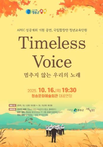 디지타임즈(DGTIMEZ) 김완태 기자 | 청송군은 오는 16일 저녁 7시 30분, 청송문화예술회관 대공연장에서 APEC 성공개최를 기원하는 국립합창단 청년교육단원 공연 ‘Timeless Voice – 멈추지 않는 우리의 노래’를 개최한다.