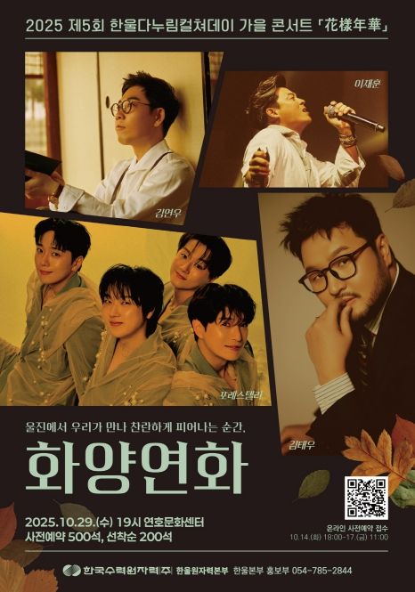 디지타임즈(DGTIMEZ) 김영호 기자 | 한국수력원자력(주) 한울원자력본부는 오는 10월 29일 19시 울진군 연호문화센터에서 ‘화양연화(花樣年華): 찬란하게 빛났던 그 순간’을 주제로, 긴 세월에도 잊히지 않는 청춘의 명곡들을 되새기며 깊어져 가는 늦가을의 정취를 나누고자 제5회 한울다누림컬쳐데이 가을 콘서트를 개최한다.