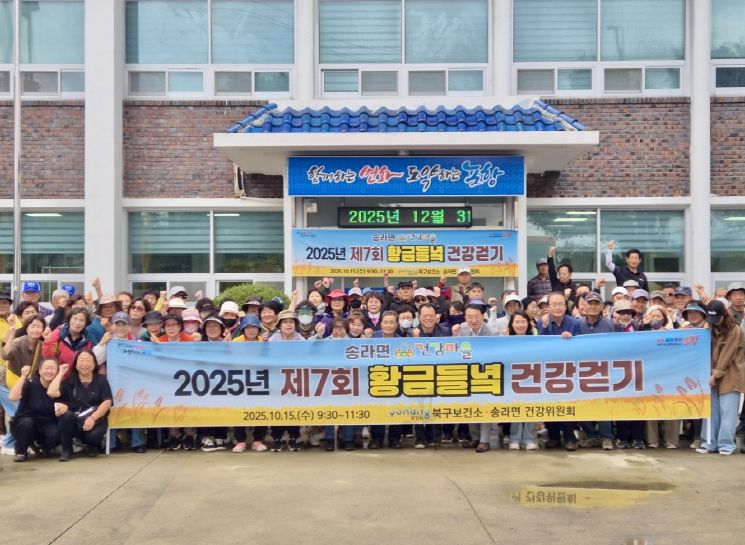 디지타임즈(DGTIMEZ) 이강옥 기자 | 포항시 북구보건소는 15일 송라면 광천리 농로길에서 마을 주민 300여 명이 참여한 가운데 ‘제7회 송라면 건강마을 황금들녘 건강걷기 행사’를 개최했다.