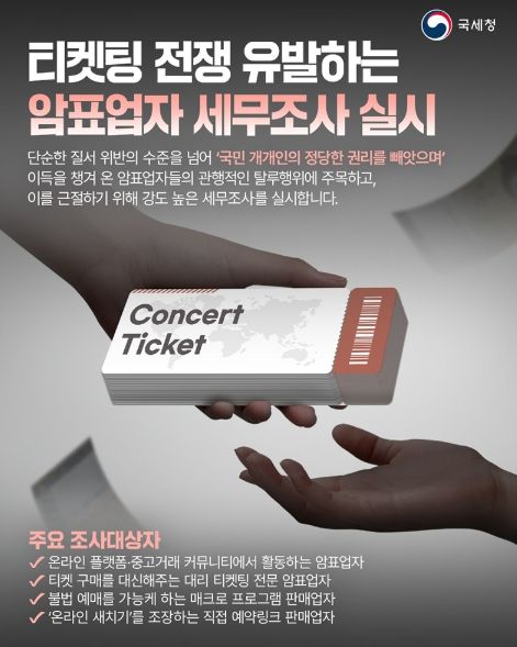 디지타임즈(DGTIMEZ) 최신형 기자 | 단순한 질서 위반의 수준을 넘어 '국민 개개인의 정당한 권리를 빼앗으며' 이득을 챙겨 온 암표업자들의 관행적인 탈루행위에 주목하고, 이를 근절하기 위해 강도 높은 세무조사를 실시합니다.