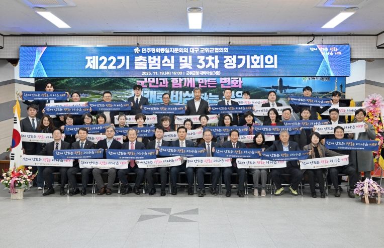 디지타임즈(DGTIMEZ) 김대경 기자 | 민주평화통일자문회의 군위군협의회(협의회장 전기식)는 11월 19일 오후 16시 군위군청 대회의실에서 군위군수, 자문위원 등 50명이 참석한 가운데 ‘제22기 출범식 및 2025년 3차 정기회의’을 개최했다.