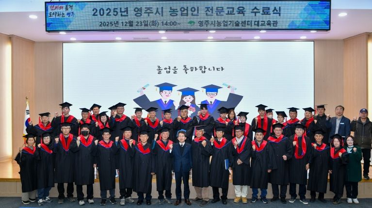 대경타임즈 최신형 기자 | 영주시는 지난 23일 농업기술센터 대교육관에서 '2025년 농업인 전문교육 수료식'을 열고, 1년간의 교육 과정을 마친 교육생 74명의 수료를 축하했다.