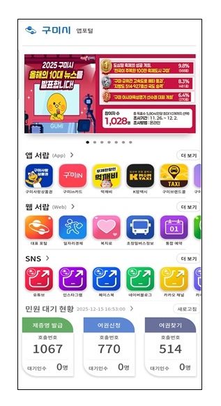 대경타임즈 최신형 기자 | 구미시는 시민들이 시정 서비스를 보다 쉽고 편리하게 이용할 수 있도록 시에서 운영 중인 모바일 앱과 웹 서비스를 한곳에 모은 ‘구미시 모바일 앱포털’을 12월 29일부터 운영한다.