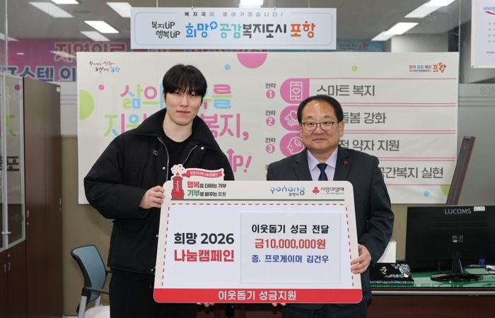 편준 포항시 복지국장은 “세계 무대에서 활약하고 있는 김건우 선수가 고향 포항을 위해 따뜻한 나눔을 실천해 주셔서 깊이 감사드린다”며 “이번 기탁이 지역사회에 희망을 전하며 선한 영향력으로 나눔 문화 확산의 계기가 되길 바란다”고 말했다.