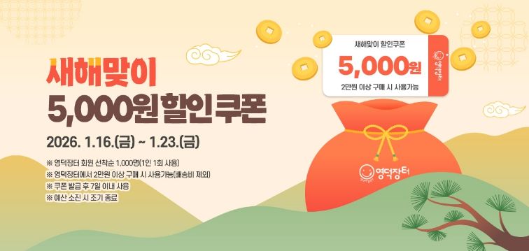 행사는 이달 16일부터 23일로, 이 기간 영덕장터 회원 중 선착순 1,000명에게 영덕군 농특산물 5,000원 할인 쿠폰이 지급한다.