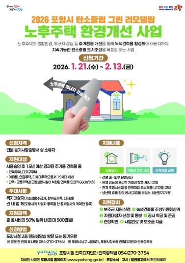 대경타임즈 이강옥 기자 | 포항시는 노후주택의 주거환경 개선과 에너지 비용 절감을 위해 2026년도 그린리모델링 지원사업을 시행한다.