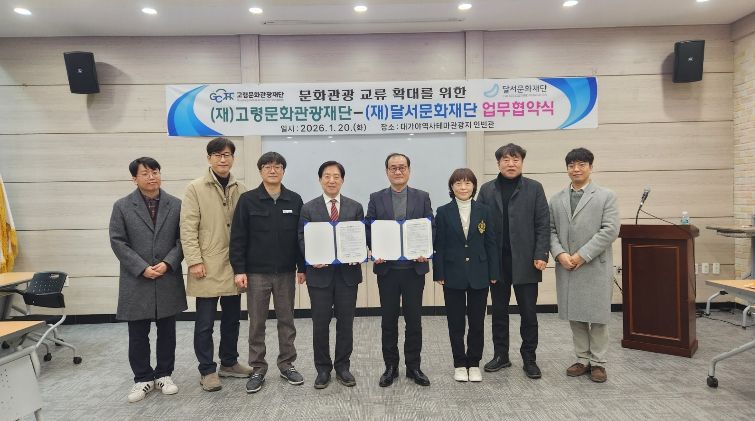 대경타임즈 김대경 기자 | (재)고령문화관광재단(대표이사 이승익)과 (재)달서문화재단(대표이사 박병구)은 지난 1월20일 고령군에 소재한 대가야역사테마관광지 인빈관에서 두 기관 관계자들이 참석한 가운데 상호협력 확대를 위한 업무협약을 체결했다. 이번 협약을 통해 경북 고령군과 대구 달서구는 문화관광분야 교류 확대에 힘을 모으기로 했다.