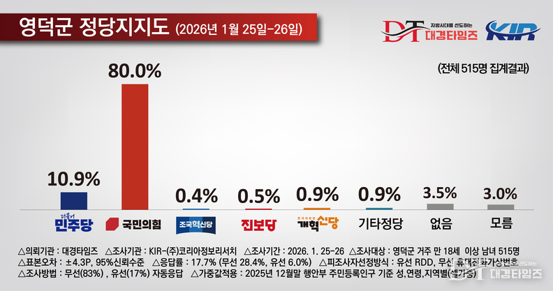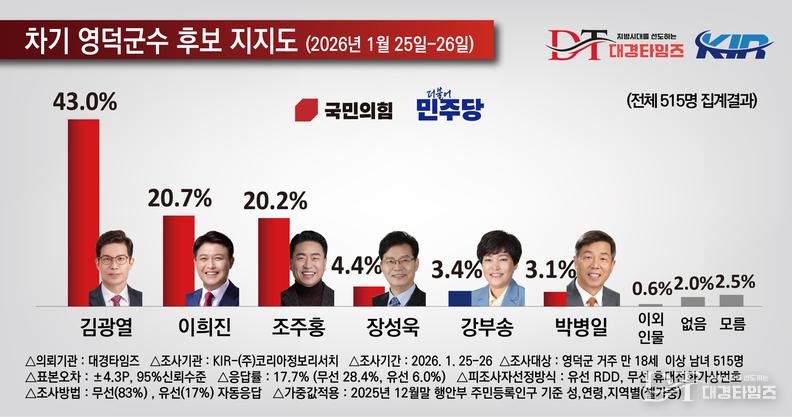 본 조사는 대경타임즈, 스트레이트뉴스 의뢰로 코리아정보리서치에서 1월 25일, 26일 이틀간 경북 영덕군 거주 만 18세 이상 남녀 515명을 대상으로, 무선전화 가상번호(83%)와 유선전화 RDD(17%)를 이용하여 자동응답 방식으로 진행됐다. 응답률은 전체 17.7%이며, 무선전화 28.4%, 유선전화 6.0%이고, 표본오차는 95%의 신뢰수준에 ±4.3%p다. 통계보정은 2025년 12월 말 행정안전부 발표 주민등록 인구 기준 성, 연령, 지역별 셀가중값을 부여했다. 보다 자세한 내용은 중앙선거여론조사심의위원회 홈페이지(https://www.nesdc.go.kr)를 참고하면 된다.