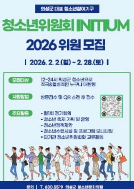 한편, 2026년 의성군청소년위원은 청소년 활동에 관심 있고 성실히 참여할 수 있는 12세부터 24세까지의 청소년이라면 누구나 지원할 수 있으며, 2월 28일까지 의성군청소년문화의집 방문 접수 또는 온라인으로 신청할 수 있다.