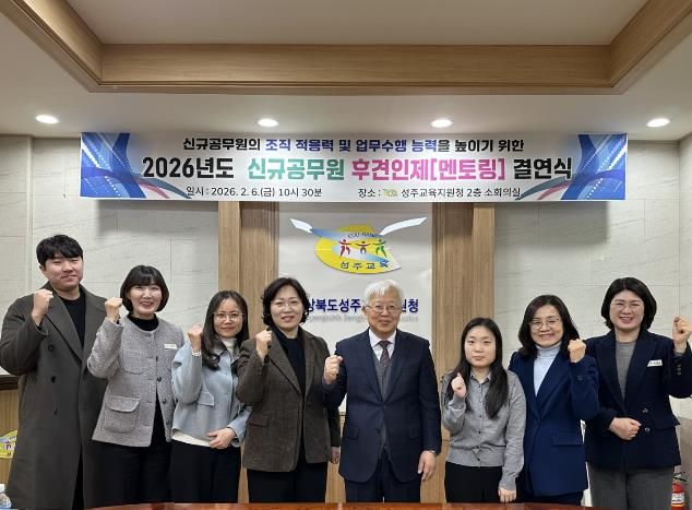 대경타임즈 남해련 기자 | 경상북도성주교육지원청은 6일 소회의실에서 2026. 1. 1.자 신규 공무원 1명, 멘토 공무원 2명이 참석하여 신규 공무원의 조직 적응력을 높이고 자신감 있는 공직 생활을 유도하고자 후견인제(멘토링) 결연식과 직무연수를 가졌다.