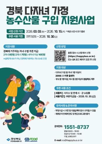 영주시는 다자녀 가정의 양육 부담 완화와 지역 농수산물 소비 활성화를 위해 ‘2026년 다자녀 가정 농수산물 구입 지원사업’을 3월 3일부터 예산 소진 시까지 신청·접수한다고 밝혔다.