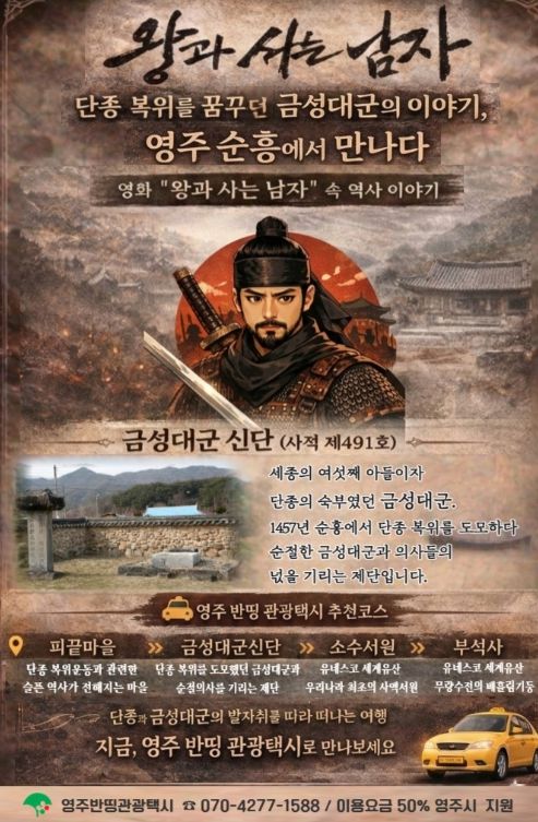 이번 추천 코스는 조선 세조 때 단종 복위를 도모하다 순절한 금성대군의 역사적 발자취를 중심으로 구성됐다. 영화 '왕과 사는 남자'가 어린 왕 단종과 그를 지키려 했던 인물들의 이야기를 담고 있는 만큼, 영주 순흥 일대에 남아 있는 관련 역사 현장을 관광택시로 편리하게 둘러볼 수 있도록 기획됐다.