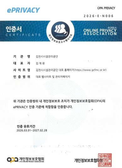 대경타임즈 김대경 기자 | 김천시시설관리공단(이사장 김재광)은 개인정보 보호 수준 향상과 안전한 정보관리 체계 구축을 위해 개인정보보호협회(OPA)가 주관하는 ‘ePRIVACY 인증’을 획득했다고 밝혔다.