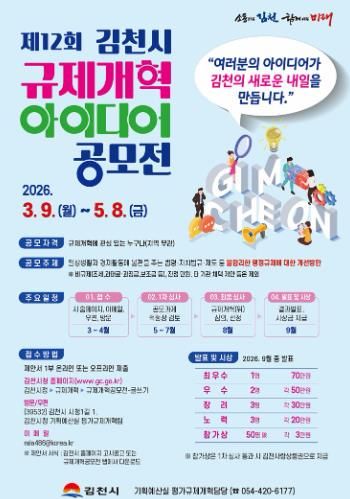 대경타임즈 김대경 기자 | 김천시는 시민의 아이디어를 바탕으로 일상생활과 기업활동 과정에서 발생하는 불합리한 규제를 개선하기 위해 제12회 규제개혁 아이디어 공모전을 개최한다.