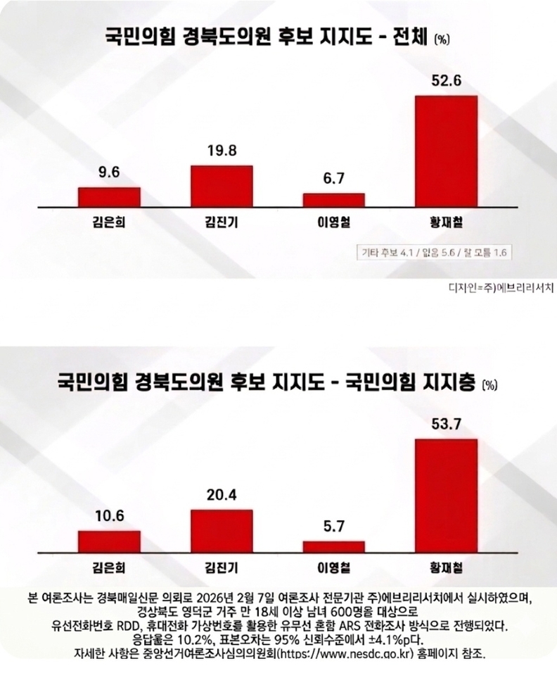 6일 여론조사 전문기관 에브리리서치가 지난 2월 7일 중앙선거여론조사심의위원회를 통해 실시한 조사 결과에 따르면, 영덕군 지역 만 18세 이상 유권자 600명을 대상으로 한 여론조사에서 황재철 예비후보는 52.6%의 지지율을 기록했다. 이는 2위인 김진기 예비후보의 19.8%와 32.8%포인트 차이로, 사실상 독주 체제를 구축한 것으로 분석된다.