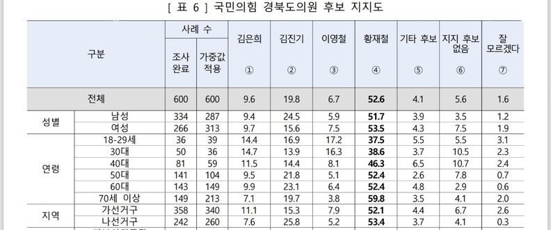 지역별 분석에서도 황재철 예비후보는 균형 잡힌 지지 기반을 보였다. 가선지구에서 52.1%, 나선지구에서 53.4%의 지지를 받으며 주요 지역 전반에서 과반을 상회하는 지지율을 확보했다.