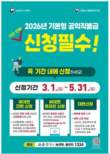 대경타임즈 김대경 기자 | 문경시는 농업인의 소득 안정을 위한 ‘2026년 기본형 공익직접지불금’신청을 3월 1일부터 5월 31일까지 농지 소재지 읍·면·동 행정복지센터 방문 또는 스마트폰, 인터넷, ARS를 통해 받는다.