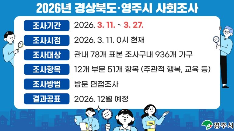 조사 기간은 3월 11일부터 27일까지 17일간이며, 표본으로 선정된 영주시 내 936가구의 가구주와 만 15세 이상 가구원을 대상으로 진행된다.