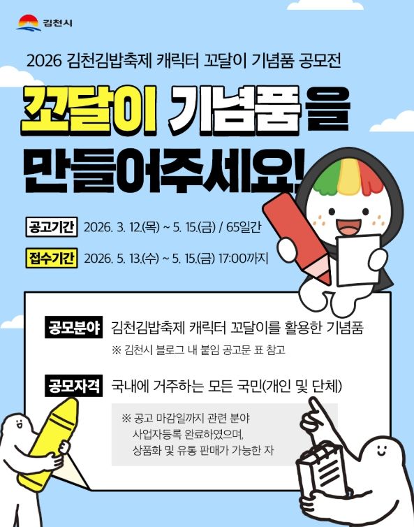 대경타임즈 김대경 기자 | 김천시는 김천김밥축제 캐릭터 ‘꼬달이’의 활성화와 창의적인 기념품 발굴을 위해 '2026 김천김밥축제 캐릭터 꼬달이 기념품 공모전'을 개최한다고 밝혔다.