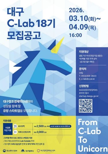 대경타임즈 최영 기자 | 대구광역시는 인공지능 전환(AX)을 선도할 혁신 기술 기업과 대구의 미래 전략 신산업을 이끌 유망 스타트업을 발굴하기 위해 ‘대구 C-Lab 액셀러레이팅 18기’ 참여기업을 오는 4월 9일까지 모집한다.