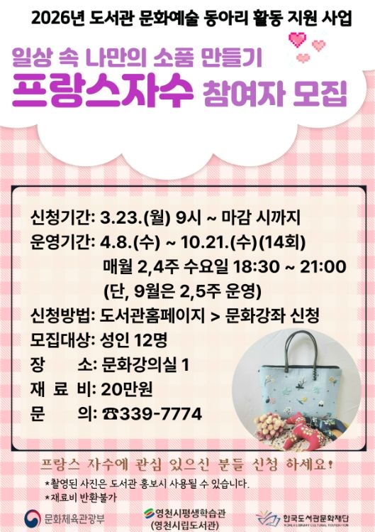 프랑스 자수 동아리는 올해 4월부터 10월까지 운영되며, 이달 23일부터 시립도서관 홈페이지에서 참여 신청을 받는다.