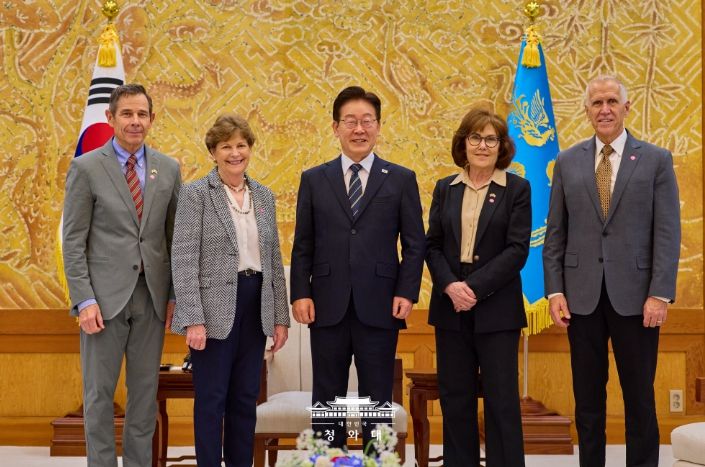대경타임즈 이강옥 기자 | 이재명 대통령은 4월 2일 오후 청와대에서 진 섀힌(Jeanne Shaheen) 상원 외교위원회 간사 등 공화·민주 양당 의원으로 구성된 미국 상원의원 대표단을 접견했다. 이 대통령과 미 대표단은 한미동맹 및 한반도 문제를 비롯해 중동 전쟁의 안보적·경제적 파장과 대응 방안에 대해 심도 있는 의견을 교환하고, 향후 경제적 여파 대응 과정에서 한미가 긴밀히 소통해 나가는 것이 중요하다는 점에 뜻을 같이 했다.
