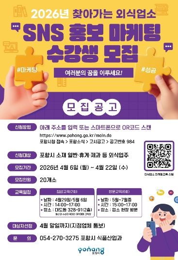대경타임즈 이강옥 기자 | 포항시는 지역 외식업소의 자생력과 온라인 홍보 역량 강화를 위해 ‘2026년 찾아가는 외식업소 SNS 마케팅 교육’ 참여 업소를 모집한다.