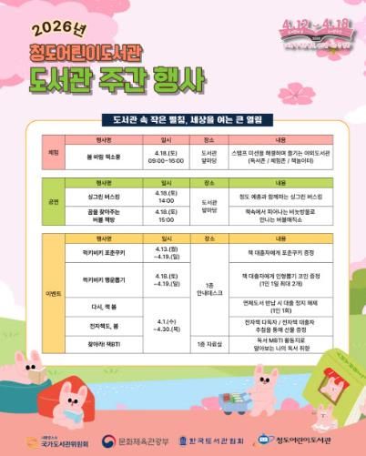 특히, 청도어린이도서관은 색다른 독서경험을 제공하기 위해 야외도서관을 테마로 한 '봄바람 책소풍'을 18일 운영한다.
