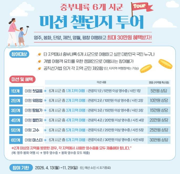이번 사업은 경상북도·충청북도·강원도 접경 지역 6개 지자체가 공동 추진하는 관광 마케팅 프로그램으로, 여행객이 각 지역 명소를 방문하고 미션을 수행하면 지역 특산물을 경품으로 제공하는 참여형 이벤트다.