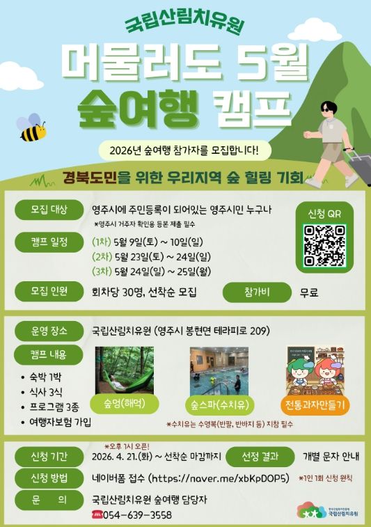 '머물러도 숲여행 캠프'는 경상북도, 영주시와 협력해 도민 행복지원사업의 일환으로 추진되며, 경북도민과 영주시민을 대상으로 월별 대상자를 구분하여 단계적으로 모집·운영하고, 8월까지 사업을 이어갈 예정이다.