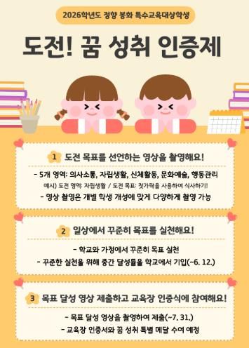 대경타임즈 김완태 기자 | 봉화교육지원청은 4월 20일 '장애인의 날'을 기념하여, 경상북도 내 최초로 특수교육대상학생의 특성을 반영해 전면 개편한 2026학년도 정향 봉화 특수교육대상학생 '도전! 꿈 성취 인증제' 참가 신청을 받고 본격적인 운영에 돌입한다고 밝혔다.