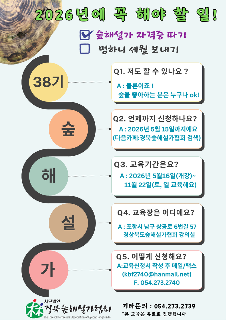 대경타임즈 엄지랑 기자 |산림청이 지정한 산림교육전문가 양성 기관인 경상북도숲해설가협회가 2026년도 숲해설가 양성 과정 38기 교육생 40명을 모집한다. 접수 기간은 2026년 5월 15일까지다.