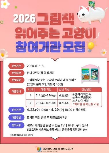 대경타임즈 김완태 기자 | 경상북도교육청 봉화도서관(관장 이영숙)은 오는 5월부터 8월 까지 관내 어린이집과 유치원을 대상으로 디지털 독서 콘텐츠 '그림책 읽어주는 고양이'프로그램 참여기관을 선착순으로모집한다.