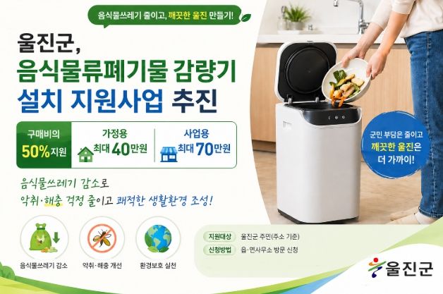 이번 사업은 감량기 구매비의 50%를 지원하는 것으로, 가정용 감량기는 최대 40만 원, 사업용 감량기는 최대 70만 원까지 보조받을 수 있다. 신청은 각 읍·면사무소에서 가능하다.
