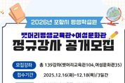 디지타임즈(DGTIMEZ) 이강옥 기자 | 포항시평생학습원은 2026년도 정규 강좌 운영을 위해 미래사회 변화에 대응할 역량을 갖춘 전문 강사 138명을 공개 모집한다고 2일 밝혔다. 모집 분야별 인원수는 뱃머리평생교육관 일반성인 강좌 58명과 시니어 강좌 30명 및 청소년 강좌 16명, 그리고 여성문화관 정규강좌 34명이다. 자격증·직업능력·문화예술·건강·정보화·외국어·스포츠 등 기존에 수요가 높은 과목뿐 아니라, 지난 11월에 발표된 교육부의 ‘AI for All’ 정책에 맞춰 생애주기별 AI 강좌를 신규 편성해 해당 강사를 모집한다. 또한 고령층을 위한 실버 분야 자격증 강좌를 여성문화관에 새로 개설해 변화하는 학습 수요와 사회적 요구를 반영할 계획이다. 강사 모집 일정은 다음과 같다. 서류 접수는 오는 16일부터 18일까지 방문 접수로 진행되며, 응시자격은 해당 분야의 전문지식과 강의 경험 보유자, 교원자격증 소지자, 관련 자격증 소지자 등이다. 서류합격자는 12월 24일 문자로 개별 통보되고, 최종 합격자는 12월 29일 평생학습원 홈페이지를 통해 발표된다. &
