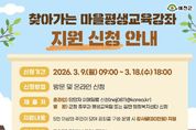 대경타임즈 김대경 기자 | 예천군은 3월 9일부터 3월 18일까지 2026년 ‘찾아가는 마을평생교육강좌’ 참여 희망자를 모집한다. ‘찾아가는 마을평생교육강좌’는 5명 이상의 군민이 학습모임을 구성해 희망 강좌를 신청하면, 예천군이 강사료를 지원해 마을과 생활권 가까이에서 평생학습을 받을 수 있도록 지원하는 사업이다. 특히 지난해 본 사업을 통해 군민들의 높은 관심과 적극적인 참여 속에 다양한 분야의 강좌가 운영되며 학습 접근성을 크게 높였고, 주민이 주도하는 학습 문화 확산과 마을 공동체 활성화에 기여하며 큰 호응을 얻었다. 이에 예천군은 군민들의 학습 수요 증가와 참여 열기를 반영해 올해는 지원 규모를 기존보다 확대해 운영할 계획이며, 선정된 학습모임에는 강좌당 최대 80만 원의 강사료를 지원한다. 신청을 희망하는 학습모임은 강사 섭외, 교육 일정 및 장소 등을 사전에 협의한 후 예천군청 홈페이지에 게시된 신청서를 작성해 이메일로 제출하거나 주소지 읍․면 행정복지센터를 통해 신청할 수 있다. 김학동 군수는 “찾아가는 마을평생교육강좌는 군민들께서 직접 배우고 싶은 내용을 스스로 기획하고