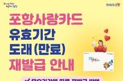 대경타임즈 이강옥 기자 | 포항시는 지역경제 활성화를 위해 유효기간이 도래하는 포항사랑카드를 사전에 확인하고 재발급을 받아 사용할 것을 당부했다. 포항사랑카드는 2020년 9월부터 발행됐으며, 발행일로부터 5년간 사용가능하다. 유효기간 만료 2개월 전부터 재발급이 가능하다. 시는 재발급 시 만료된 기존 카드 잔액을 새 카드로 이전해 사용할 수 있도록 하고 있다. 이를 통해 미사용 잔액이 골목상권에 신속히 유입돼 소비촉진을 통한 지역 내 자금의 선순환을 유도하고 시민의 불이익이 최소화될 수 있기를 기대하고 있다. 재발급 안내는 포항사랑상품권 운영대행사인 iM뱅크를 통해 유효기간 만료 60일 전 문자로 발송되며, 읍면동 행정복지센터와 판매대행 금융기관, 시 홈페이지 등을 통해서도 확인할 수 있다. 카드 재발급과 잔액 이전은 포항사랑상품권 모바일 앱 ‘iM샵’ 또는 iM뱅크 영업점 방문을 통해 가능하다. 영업점 방문 시에는 신분증과 기존 카드를 지참해야 한다. 또한 포항시청 2층 안내데스크과 읍면동 행정복지센터에서 공카드를 수령한 뒤 모바일 앱 iM샵에 등록해 잔