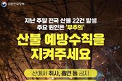 대경타임즈 최신형 기자 | 지난 주말 전국 산불 22건 발생 주요 원인은 '부주의' 산불 예방수칙을 지켜주세요 · 산에서 취사, 흡연 등 금지 · 산 근처에서 쓰레기 소각 금지 · 연기, 불씨 보면 119 신고 "불법소각, 꽁초 투기 등 위반 행위 엄정 대응"