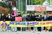 디지타임즈(DGTIMEZ) 김영호 기자 | 11월 13일 이른 아침, 성주고등학교 정문 앞에는 특별한 응원의 손길이 모였다. (재)성주군별고을장학회는 2026학년도 대학수학능력시험을 앞둔 지역 수험생들을 격려하기 위해 현장 응원에 나섰다. 이날 오전 7시 30분부터 시작된 격려행사에는 이병환 성주군수(장학회 이사장)를 비롯해 장학회 임원진, 성주군의회 이화숙 부의장, 김성우 의원 그리고 유관기관 및 교육관계자 등 50여명이 참석했다. 특히, 성주고 후배 학생 20여명이 자발적으로 선배들을 응원하기 위해 함께 모여 훈훈한 감동을 더했다. 응원단은 시험장에 입실하는 수험생들을 향해 현수막과 피켓을 들고 응원의 메시지를 전했으며 응원단의 진심 어린 응원에 긴장된 표정이던 수험생들도 미소를 지으며 힘찬 발걸음을 내디뎠다. 올해 장학회는 수능을 앞둔 11월 한 달을 ‘수험생 응원의 달’로 정하고 다각도로 지원에 나섰다. 관내 고등학교 3학년 전체에게 시험 준비에 도움이 될만한 대용량 보조배터리를 배부했으며, 성주읍, 선남면 등 주요 소재지 6곳에는 격려 현수막을 설치해 지역사회 전체가 수험생을 응원하는 분위기를 조성했다