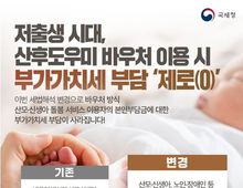 디지타임즈(DGTIMEZ) 최신형 기자 | ■ 저출생 시대, 산후도우미 바우처 이용 시 부가가치세 부담 '제로(0)' 이번 세법해석 변경으로 바우처 방식 산모·신생아 돌봄 서비스 이용자의 본인부담금에 대한 부가가치세 부담이 사라집니다! (기존) 바우처 방식의 산모·신생아 돌봄 서비스 이용 시 본인부담금에 대한 부가세 부과 (변경) 산모·신생아, 노인·장애인 등 바우처 방식 사회복지 서비스 이용자들의 본인부담금 부가세 면세 앞으로도 국세청은 세법 집행과정에서 불합리한 측면이 있는지 세심히 살피고, 저출생 관련 세금 부담을 줄이는 등 '합리적이고 따뜻한 세정' 구현을 위해 최선의 노력을 다하겠습니다!
