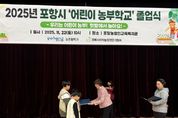 디지타임즈(DGTIMEZ) 이강옥 기자 | 포항시는 22일 농업인교육복지관에서 2025년 하반기 ‘어린이농부학교’ 졸업식을 진행했다. 이날 행사에는 수료 어린이와 가족, 관계자 등 80여 명이 참석해 지난 4개월간의 활동을 돌아보고 성장을 함께 축하하는 시간을 가졌다. 졸업식은 텃밭 골든벨 퀴즈, 수료증 및 기념품 전달, 소감 발표, 단체사진 촬영 순으로 진행됐다. 포항시 어린이농부학교는 상·하반기로 운영되며, 이번 하반기 과정은 8월부터 11월까지 매주 토요일 총 12회차 프로그램으로 구성됐다. 참여한 어린이 30명 전원이 성실히 전 과정을 마치고 졸업장을 받았다. 교육은 텃밭 채소 재배, 벼 베기 및 탈곡 체험, 환경 감수성을 기르는 활동 등 이론과 실습을 병행한 도시농업 프로그램으로 구성돼 높은 호응을 얻었다. 특히 커피박 유기비료 만들기, 누에 키우기, 허수아비 만들기, 수확 작물로 진행한 팜파티 등 체험 중심 프로그램이 큰 인기를 끌었으며, 가족 단위로 참여할 수 있어 교육 효과도 더욱 높았다는 평가다. 이현주 포항시 농업기술센터 소장은 “어린이들이