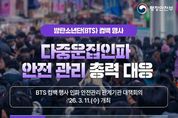 대경타임즈 최신형 기자 | 방탄소년단(BTS) 컴백 행사 다중운집인파 안전 관리 총력 대응 - BTS 컴백 행사 인파 안전관리 관계기관 대책회의 '26.3.11.(수) 개최 ▲ 행정안전부 - 다중운집인파 재난 위기경보 '주의' 단계 발령 일시: 3.21.(토) 00:00~24:00 / 지역: 서울 종로구·중구 - '정부합동안전점검단' 구성, 안전관리 실태 사전 점검 ▲ 문화체육관광부 - 공연 안전을 위한 자문 및 무대시설·객석 점검 ▲ 보건복지부 응급 환자 발생 대비, 재난의료지원팀(DMAT) 및 보건소 신속대응반 출동체계 사전 구축 ▲ 경찰·소방 - 행사장 주변 질서 유지 및 치안 확보, 대테러 방지 활동 - 구조·구급요원·구급차 현장 배치 ▲ 서울시 - 시민안전대책본부 가동, 안전관리계획 이행 여부 확인 - 안전 안내 문자 발송 및 질서 있는 관람 유도